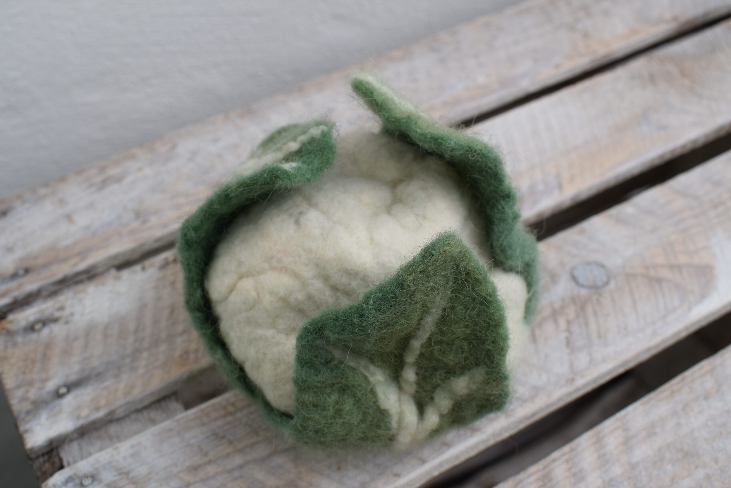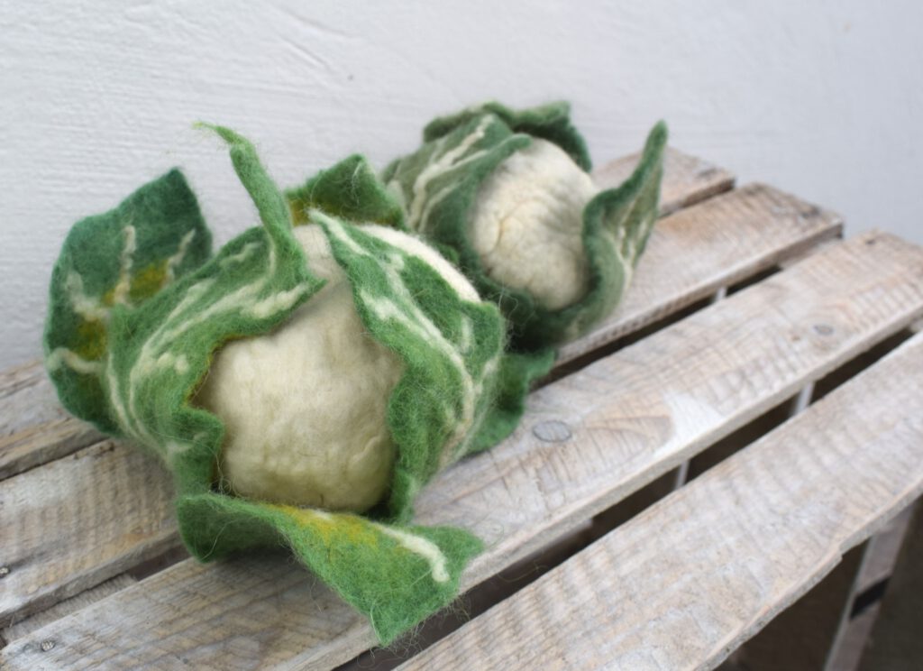 während der Adventszeit hatte ich Euch verschiedentlich versprochen, nächstes Jahr kommen ein paar neue Gemüse- und Obstsorten zum Angebot für den Kaufladen dazu. Soweit so gut. Außerdem habe ich eine wunderbare Anfrage für einen realistisch gefilzten Krautskopf in Originalgröße. Also kümmere ich mich jetzt erst mal um die Kohlsorten. Allen voran den Blumenkohl.