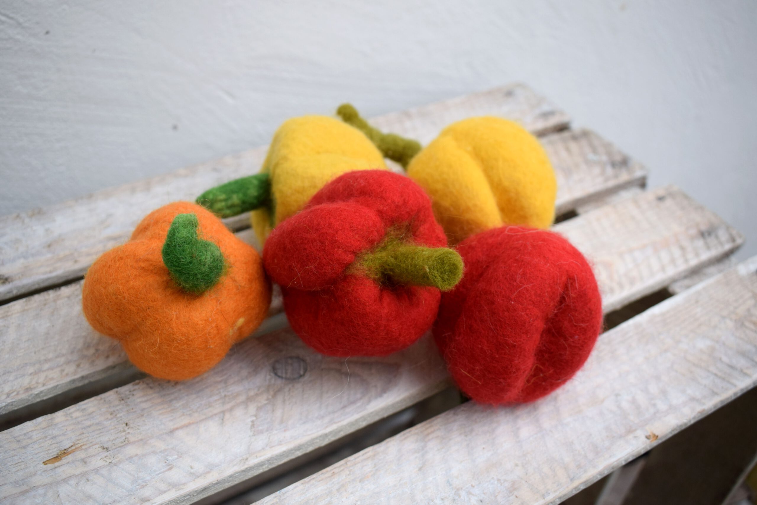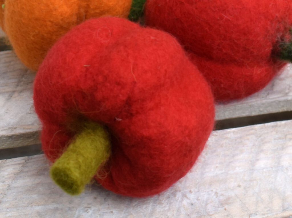 Auch hier hat mich nicht das Filzen einer einzelnen Paprikafrucht davon abgehalten, das als Produkt in mein Portfolio aufzunehmen, sondern die Produktion. Natürlich kann man eine Paprikafrucht aus Wolle in Kleinarbeit aufbauen und filzen. Aber schon das ist nicht einfach. Und natürlich kann man eine Paprikafrucht in drölfzig Stunden Nadelfilzen. Wer das aber zum Verkauf produzieren möchte, muss sich was anderes einfallen lassen. Deshalb ging das jetzt auch so lange, bis ich eine Methode gefunden habe, die Form einigermaßen schnell, reproduzierbar nass zu filzen.